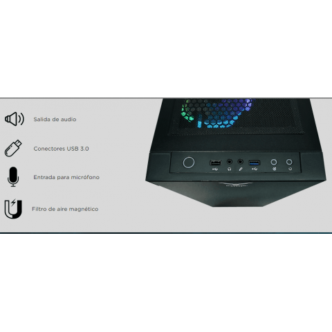 | Puertos del Panel Frontal | 2 x USB 2.0 1 x USB 3.0 1 x Salida de audio 1 x Entrada de micrófono | |