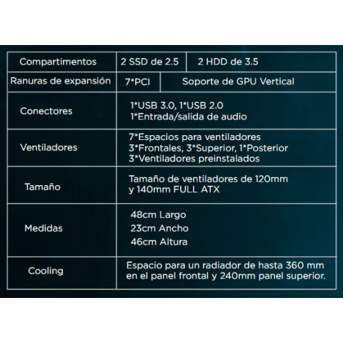 | Ventiladores | 3 x 120 o 140 mm Frontales 3 x 120 o 140 mm Superiores (Incluidos) 1 x 120 o 140 mm Posterior | |